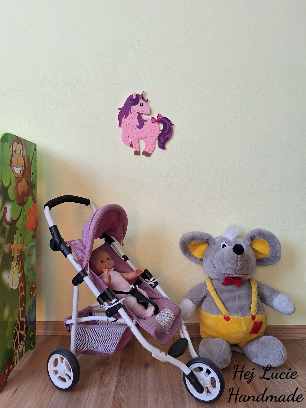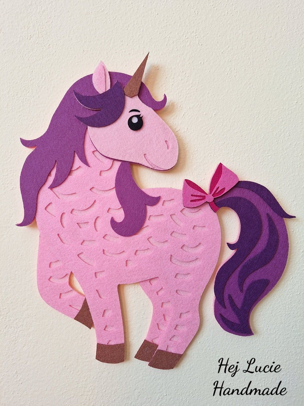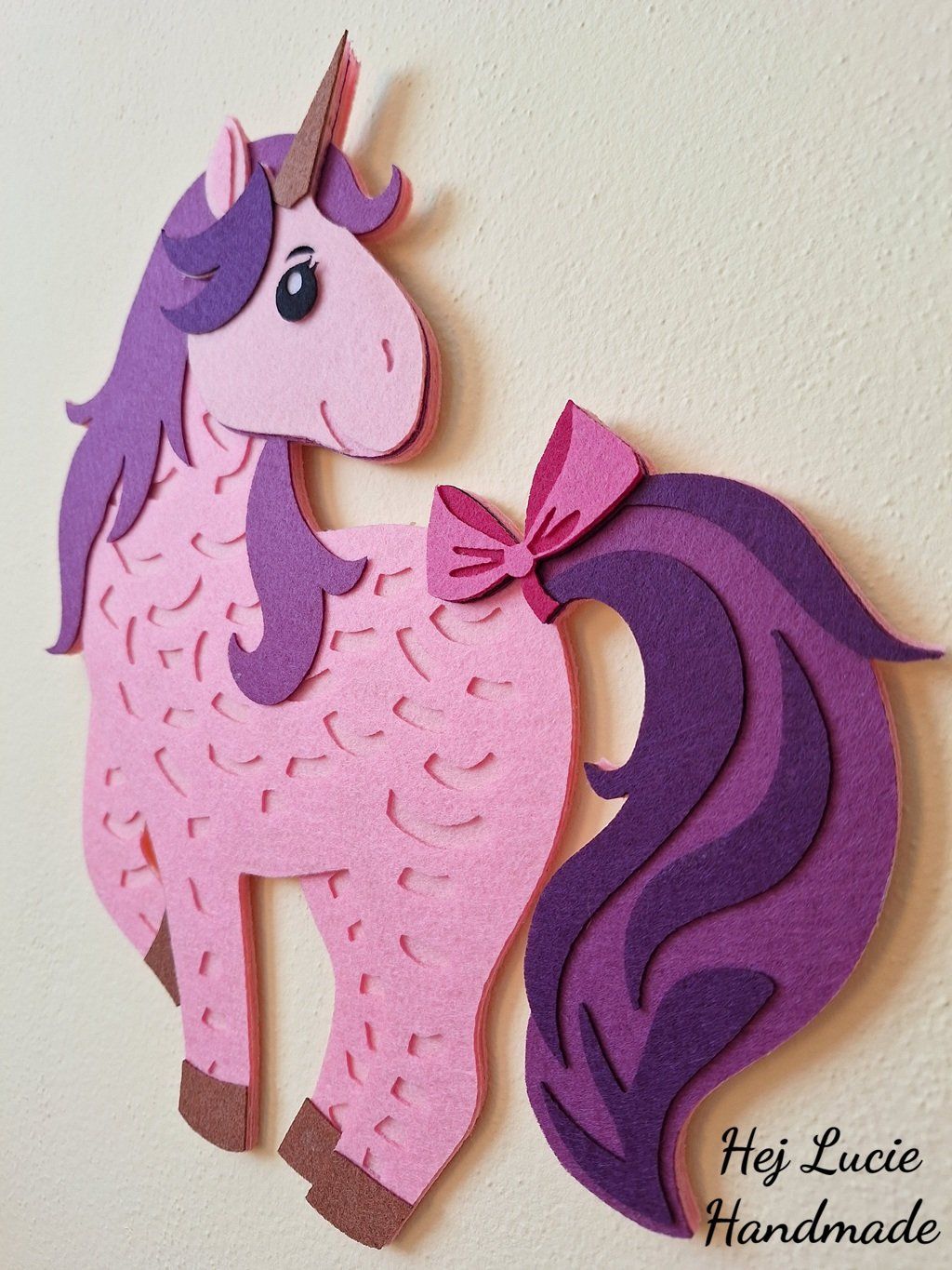 Jednorožec je ručně vyrobený z několika vrstev filcu nalepených na sobě, což působí 3D dojmem. Jednorožec je opatřen poutkem na zavěšení umístěným na zadní straně, poutko není po zavěšení na zeď viditelné.