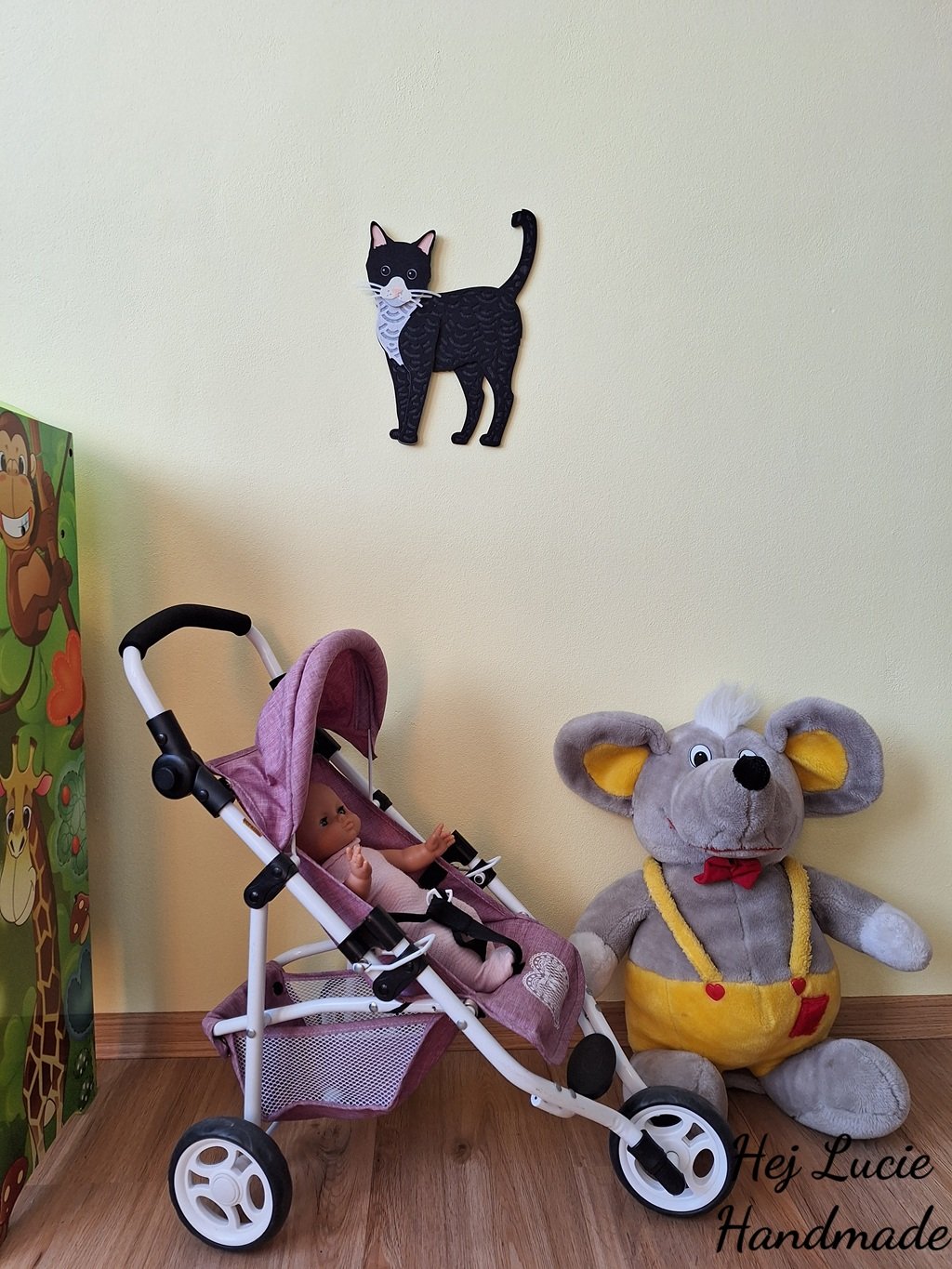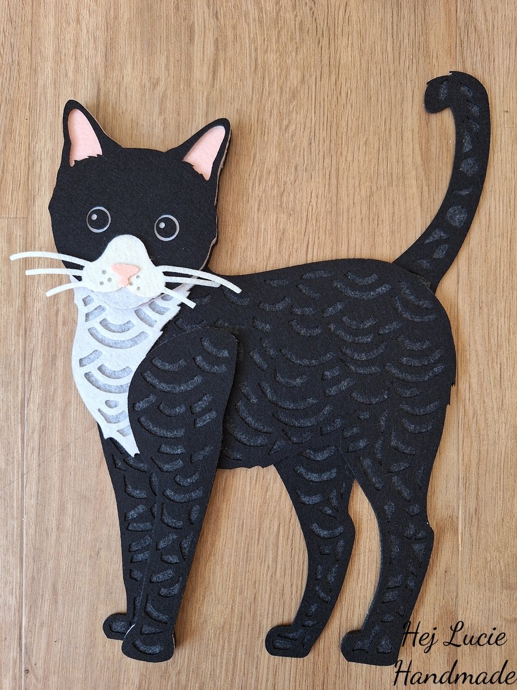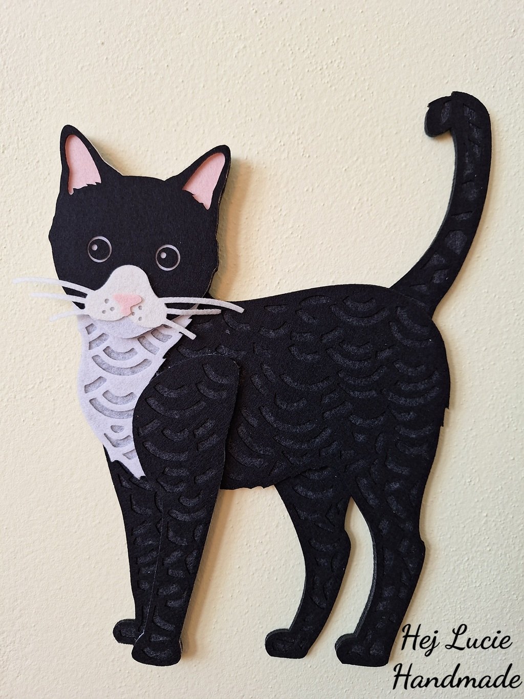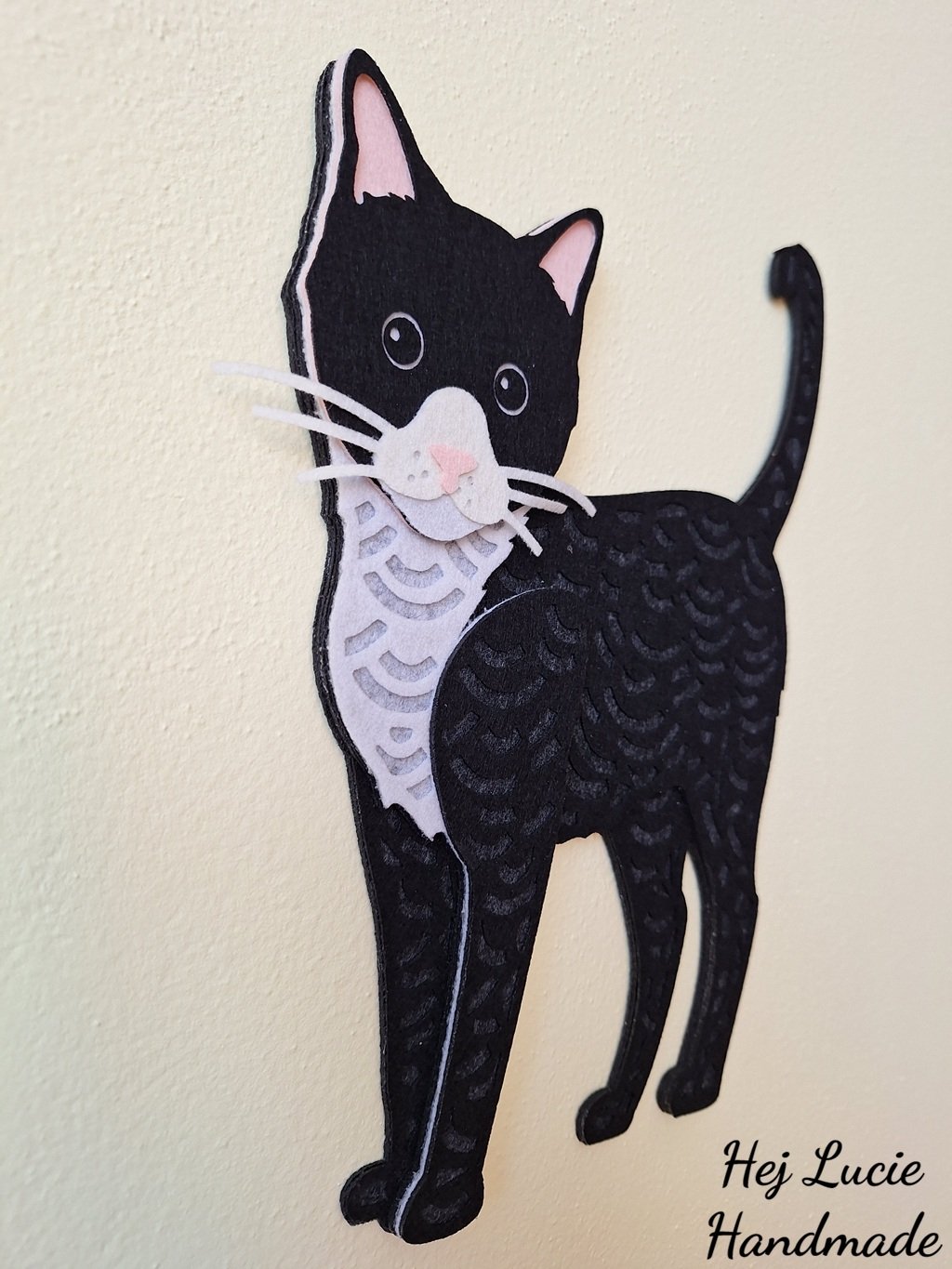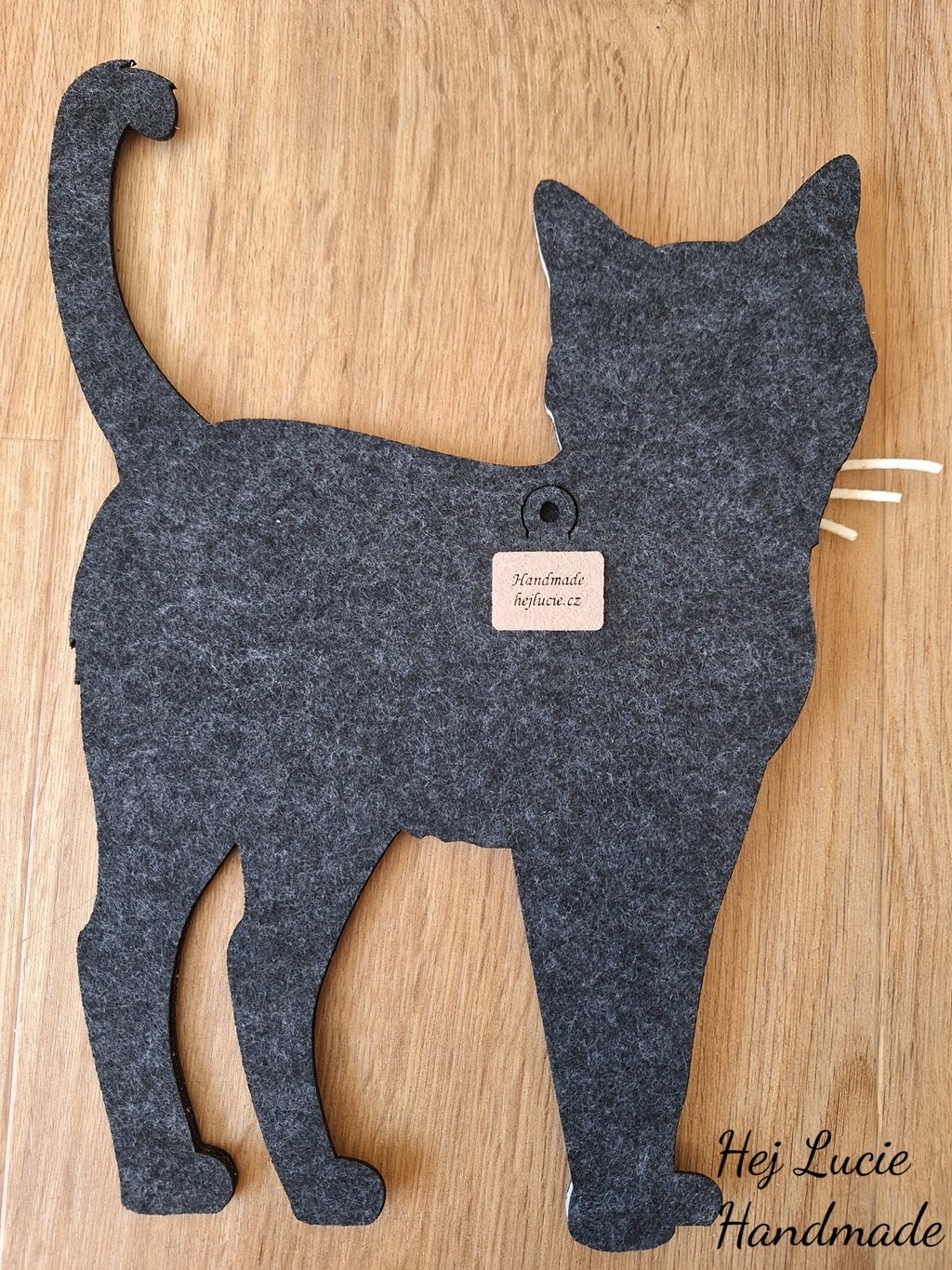 Kočička je ručně vyrobená z několika vrstev filcu nalepených na sobě, což působí 3D dojmem. Kočička je opatřena poutkem na zavěšení umístěným na zadní straně, poutko není po zavěšení na zeď viditelné.