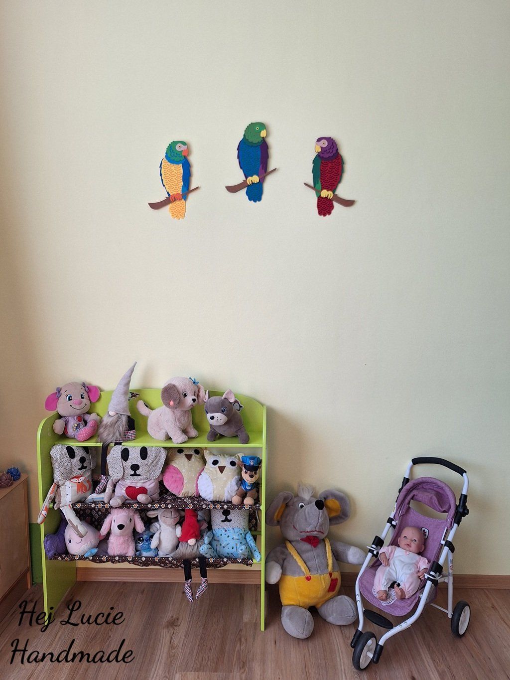 Papoušek je ručně vyrobený z několika vrstev filcu nalepených na sobě, což působí 3D dojmem. Papoušek je opatřen poutkem na zavěšení umístěným na zadní straně, poutko není po zavěšení na zeď viditelné.