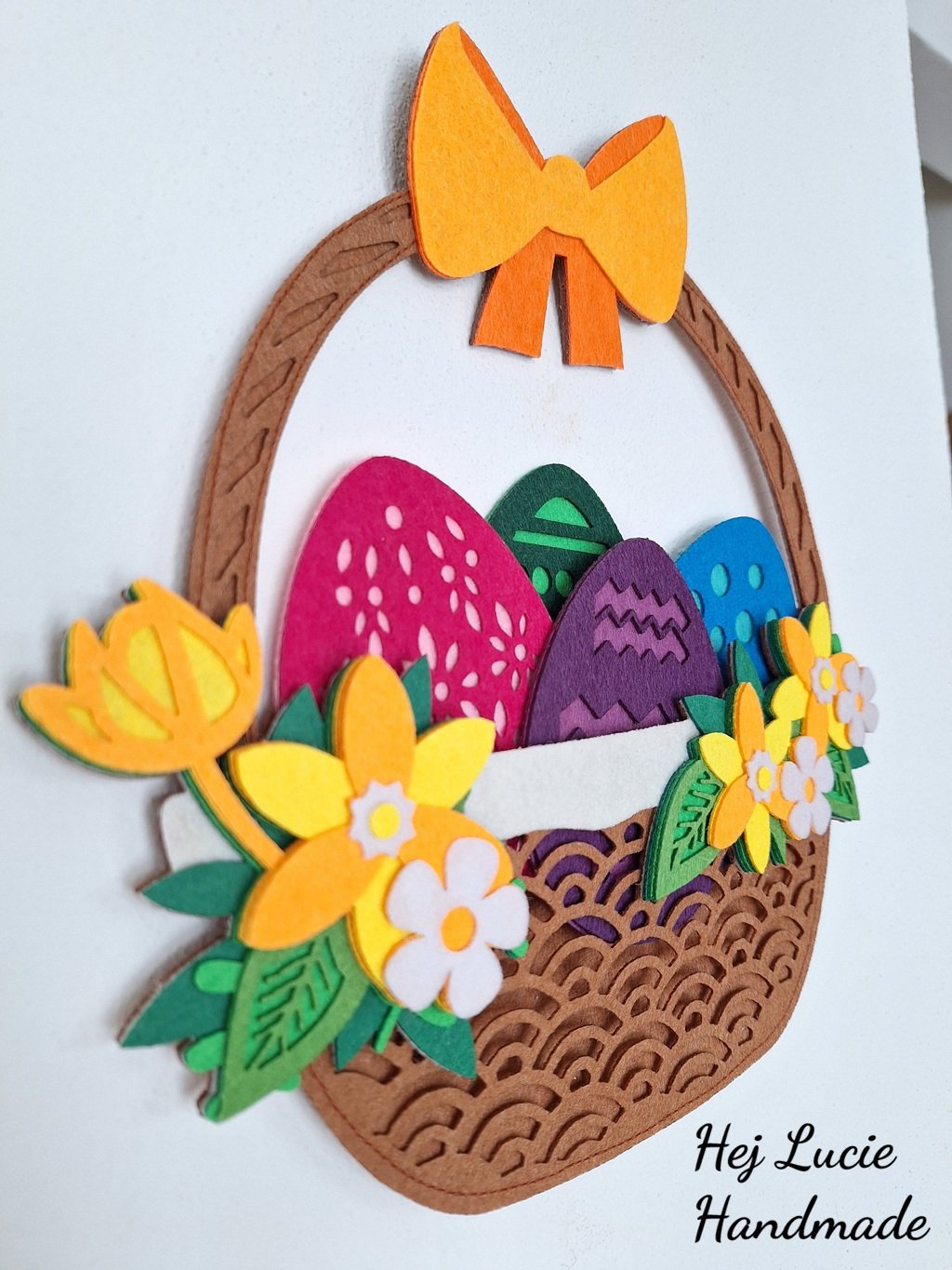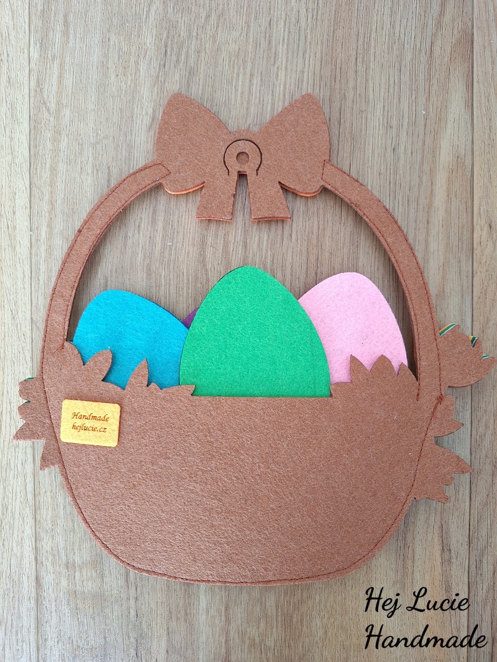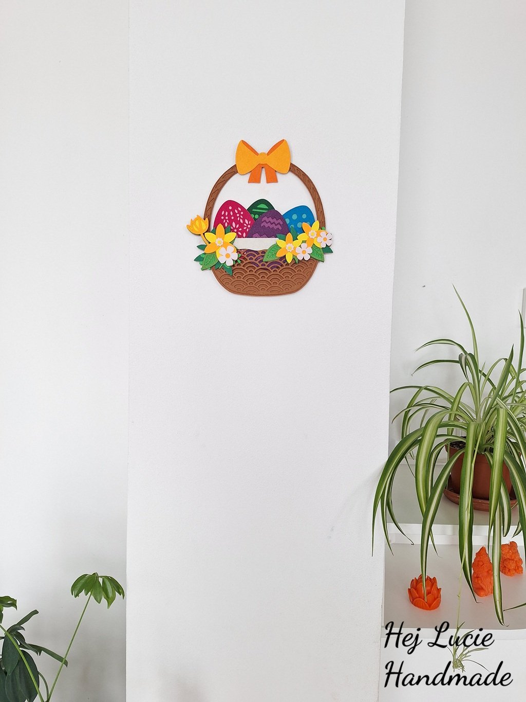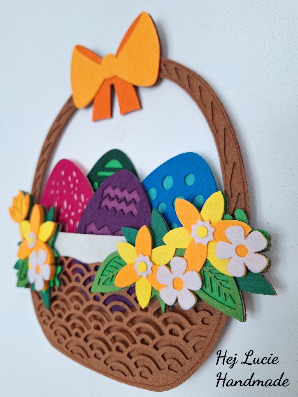 Košík s kraslicemi je ručně vyrobený z několika vrstev filcu nalepených na sobě, což působí 3D dojmem. Košík je opatřen poutkem na zavěšení umístěným na zadní straně, poutko není po zavěšení na zeď viditelné.