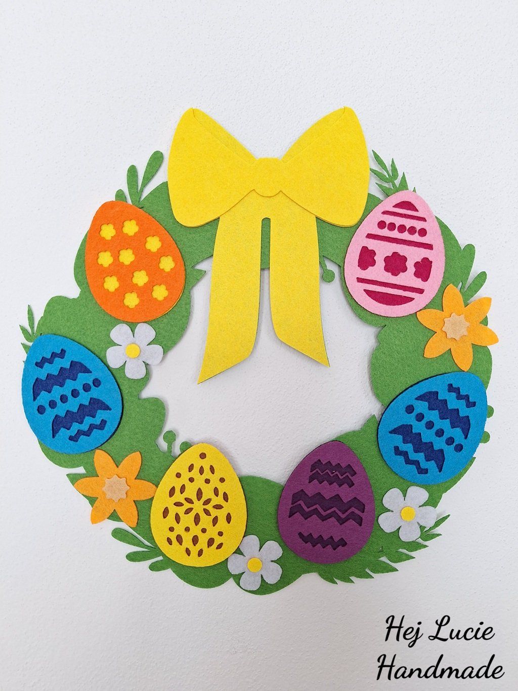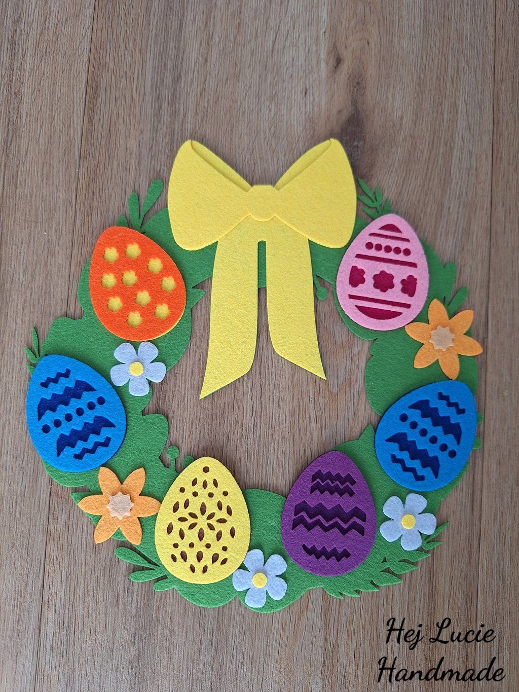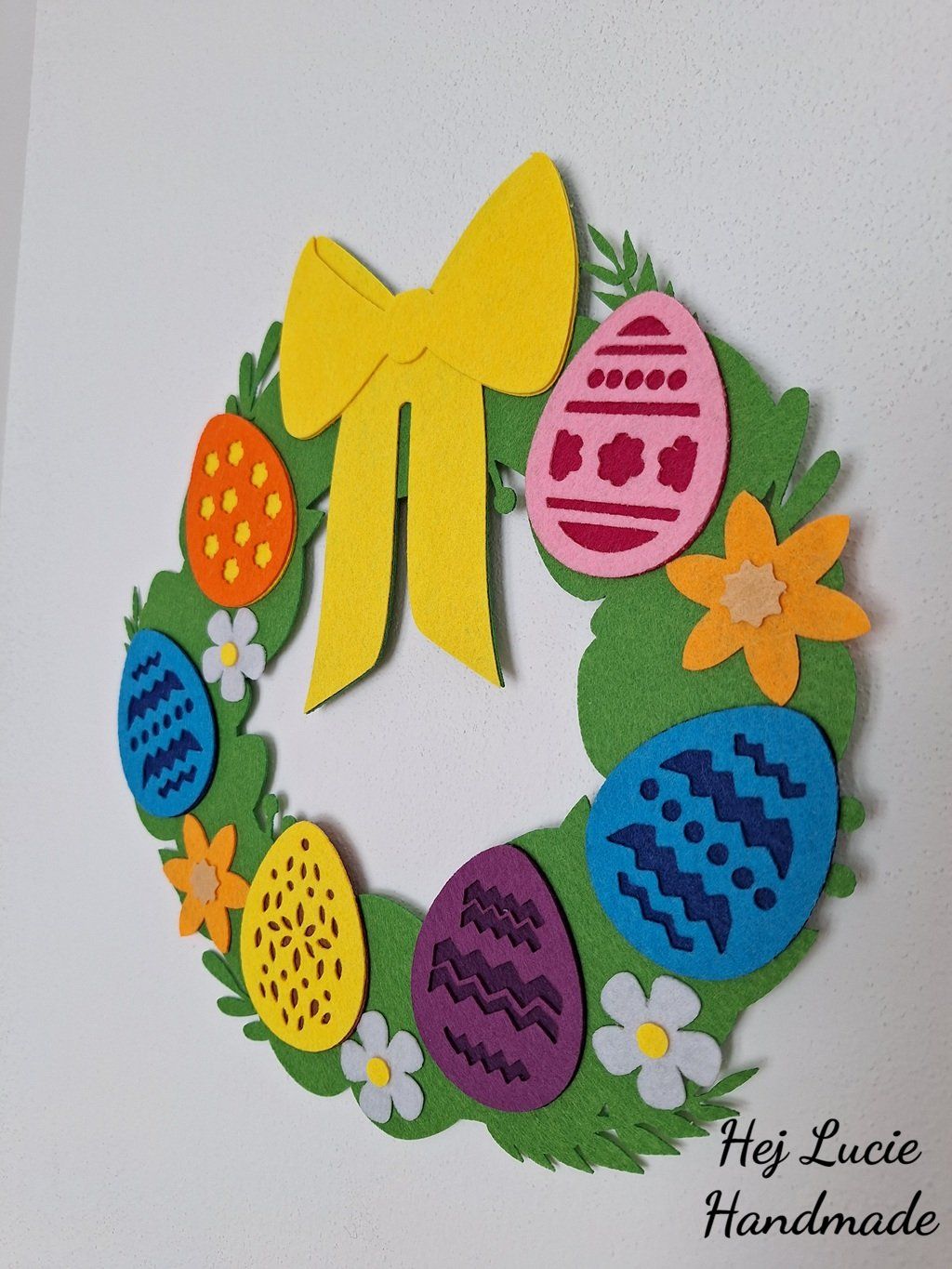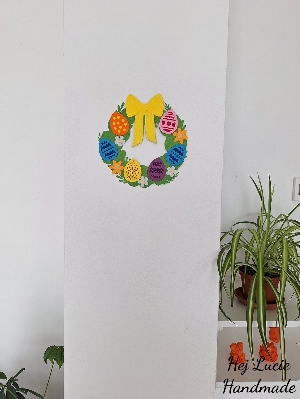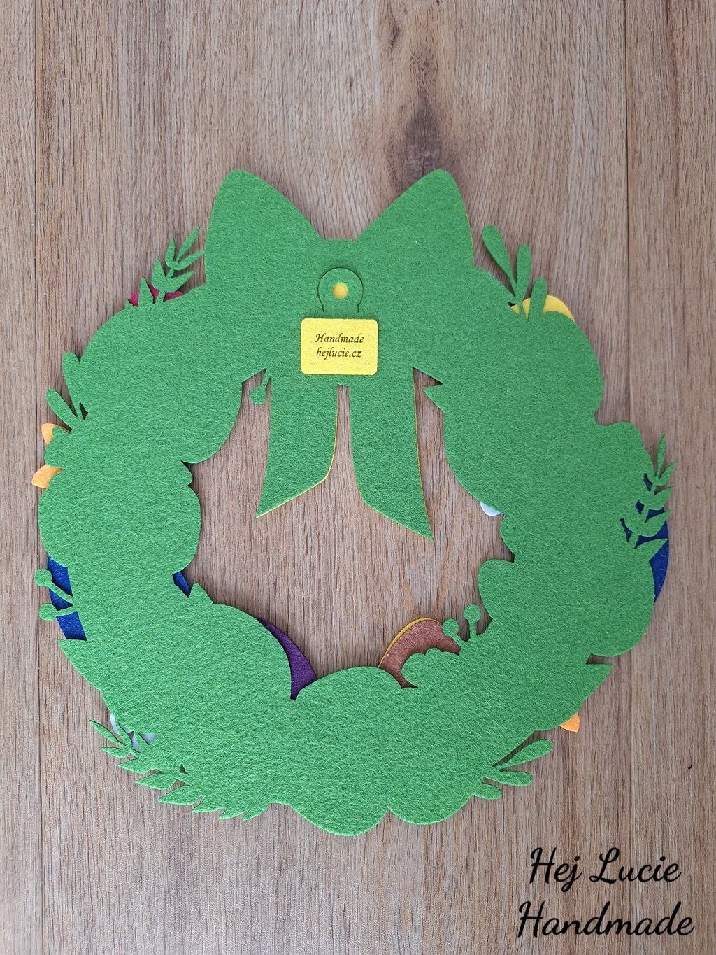 Věneček je ručně vyrobený z několika vrstev filcu nalepených na sobě. Věneček je opatřen poutkem na zavěšení umístěným na zadní straně, poutko není po zavěšení na zeď viditelné.